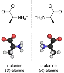 ʟ-amino acids are the mirror reflection of ᴅ-amino acids, and vice versa. In this example, alanine is depicted in the zwitterionic form at physiological pH.
