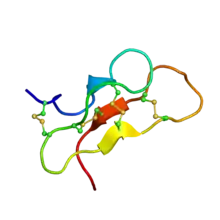 δ-Palutoxins are very compact proteins due to their four disulfide bridges.[3] These bindings result in a disulfide pseudo-knot, characteristic for a class of toxins that contain the ‘inhibitor cystine knot motif’ (ICK). This motif is responsible for their high in vivo stability.[3] Members of the ICK family are characterized by a triple-stranded, antiparallel β-sheet structure, stabilized by disulfide bridges. Within this fold-class, the biological activities of the toxins are very diverse. The disulfide bonding pattern found in δ-Palutoxins is very similar to the pattern seen in μ-Agatoxins.[2] This indicates strong homologies with the μ-Agatoxins from Agelenopsis aperta.[4]