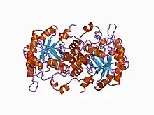 Aminolevulinic acid dehydratase (porphobilinogen synthase, or ALA dehydratase, or aminolevulinate dehydratase) is an enzyme (EC 4.2.1.24) that in humans is encoded by the ALAD gene.[5][6] Porphobilinogen synthase (or ALA dehydratase, or aminolevulinate dehydratase) synthesizes porphobilinogen through the asymmetric condensation of two molecules of aminolevulinic acid. All natural tetrapyrroles, including hemes, chlorophylls and vitamin B12, share porphobilinogen as a common precursor. Porphobilinogen synthase is the prototype morpheein.[7]