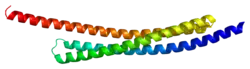 Diablo homolog (DIABLO) is a mitochondrial protein that in humans is encoded by the DIABLO (direct IAP binding protein with low pI) gene on chromosome 12.[5][6][7] DIABLO is also referred to as second mitochondria-derived activator of caspases or SMAC. This protein binds inhibitor of apoptosis proteins (IAPs), thus freeing caspases to activate apoptosis.[7][8] Due to its proapoptotic function, SMAC is implicated in a broad spectrum of tumors, and small molecule SMAC mimetics have been developed to enhance current cancer treatments.[7][9]