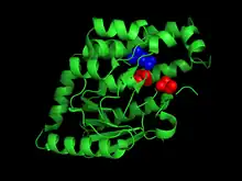 The NH-containing residues have been identified as Ala70 and Leu126 and the glutamate as Glu158 in peroxisomal enzymes in a yeast species, Saccharomyces cerevisiae. Their relative locations on the enzyme can be compared in figure 2.[4]