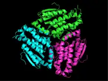 The enzymes of the hydratase/isomerase or crotonase superfamily are typically trimeric disks dimerized into hexamers. The wide range of their substrate-enzyme specificity derives from the variations in the distances between the trimeric disks and their orientation.[20] However, the human mitochondrial enoyl-CoA isomerase is a trimer and orients the fatty acid tail in a completely different direction from that seen in the hexamers.[8] The trimeric disk of peroxisomal enzymes in Saccharomyces cerevisiae is displayed in figure 3.[20]