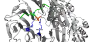 A degron can be converted into its active form by a post-translational modification[19] such as phosphorylation of a tyrosine, serine or threonine residue.[20] In this case, the ubiquitin ligase exclusively recognizes the phosphorylated version of the substrate due to stabilization within the binding site. For example, FBW7, the F-box substrate recognition unit of an SCFFBW7ubiquitin ligase, stabilizes a phosphorylated substrate by hydrogen binding its arginine residues to the phosphate, as shown in the figure to the right. In absence of the phosphate, residues of FBW7 repel the substrate.[18]