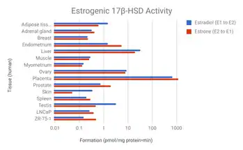 - HSD17B1: Referred to as "estrogenic". Major subtype for activation of estrogens from weaker forms (estrone to estradiol and 16α-hydroxyestrone to estriol). Catalyzes the final step in the biosynthesis of estrogens. Highly selective for estrogens; 100-fold higher affinity for estranes over androstanes. However, also catalyzes the conversion of DHEA into androstenediol.[10] Recently, has been found to inactivate DHT into 3α- and 3β-androstanediol.[10][11] Expressed primarily in the ovaries and placenta but also at lower levels in the breast epithelium.[12][10] Major isoform of 17β-HSD in the granulosa cells of the ovaries.[13] Mutations and associated deficiency have not been reported in humans.[14] Knockout mice show altered ovarian sex steroid production, normal puberty, and severe subfertility due to defective luteinization and ovarian progesterone production.[15]
