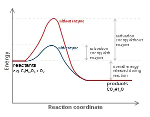 The favoured model for the enzyme–substrate interaction is the induced fit model.[49] This model proposes that the initial interaction between enzyme and substrate is relatively weak, but that these weak interactions rapidly induce conformational changes in the enzyme that strengthen binding. These conformational changes also bring catalytic residues in the active site close to the chemical bonds in the substrate that will be altered in the reaction.[50] Conformational changes can be measured using circular dichroism or dual polarisation interferometry. After binding takes place, one or more mechanisms of catalysis lower the energy of the reaction's transition state by providing an alternative chemical pathway for the reaction. Mechanisms of catalysis include catalysis by bond strain; by proximity and orientation; by active-site proton donors or acceptors; covalent catalysis and quantum tunnelling.[38][51]