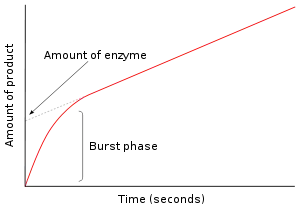 In the figure to the right, the enzyme produces E* rapidly in the first few seconds of the reaction. The rate then slows as steady state is reached. This rapid burst phase of the reaction measures a single turnover of the enzyme. Consequently, the amount of product released in this burst, shown as the intercept on the y-axis of the graph, also gives the amount of functional enzyme which is present in the assay.[39]