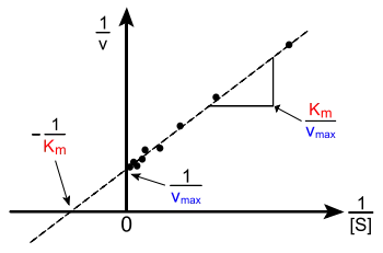 The Lineweaver–Burk plot or double reciprocal plot is a common way of illustrating kinetic data. This is produced by taking the reciprocal of both sides of the Michaelis–Menten equation. As shown on the right, this is a linear form of the Michaelis–Menten equation and produces a straight line with the equation y = mx + c with a y-intercept equivalent to 1/Vmax and an x-intercept of the graph representing −1/KM.