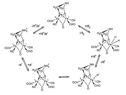 The exact mechanism by which this reaction occurs is still not entirely known; however, several intermediates have been identified in steady-state conditions.[2] A proposed mechanism for the catalyzed reaction by ferredoxin hydrogenase is: