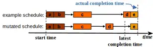 In addition to the primary objectives resulting from the task itself, it may be necessary to include auxiliary objectives in the assessment to support the achievement of one or more primary objectives. An example of a scheduling task is used for illustration purposes. The optimization goals include not only a general fast processing of all orders but also the compliance with a latest completion time. The latter is especially necessary for the scheduling of rush orders. The second goal is not achieved by the exemplary initial schedule, as shown in the adjacent figure. A following mutation does not change this, but schedules the work step d earlier, which is a necessary intermediate step for an earlier start of the last work step e of the order. As long as only the latest completion time is evaluated, however, the fitness of the mutated schedule remains unchanged, even though it represents a relevant step towards the objective of a timely completion of the order. This can be remedied, for example, by an additional evaluation of the delay of work steps. The new objective is an auxiliary one, since it was introduced in addition to the actual optimization objectives to support their achievement. A more detailed description of this approach and another example can be found in.[22]