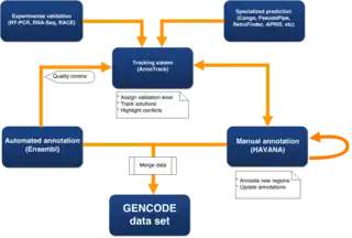 Putative loci can be verified by wet-lab experiments and computational predictions are analysed manually.[15] Currently, to ensure a set of annotation covers the complete genome rather than just the regions that have been manually annotated, a merged data set is created using manual annotations from HAVANA, together with automatic annotations from the Ensembl automatically annotated gene set. This process also adds unique full-length CDS predictions from the Ensembl protein coding set into manually annotated genes, to provide the most complete and up-to-date annotation of the genome possible.[16]