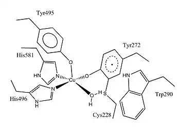 Galactose oxidase is a type II copper protein.[1][8] It contains a single copper center that adopts square planar or square-based pyramidal coordination geometry.[3][4][9] The copper center has five coordinating ligands: two tyrosines (Tyr272 and Tyr495), two histidines (His496 and His581), and a solvent molecule that is usually water.[3][4] The copper in the active site of galactose oxidase is described as having a "distorted square pyramidal" coordination geometry.[3][4] Tyr495 is the axial ligand, the other four ligands lie roughly in a plane. Both histidines coordinate with copper through 3-nitrogen.[3] Copper-H2O bond is the longest coordinate bond;[3][4] it is labile and can be replaced by a substrate molecule. Tyr272 forms a dimer with a cysteine (Cys228) through an ortho carbon of tyrosine and the sulfur atom of cysteine, which is supported by X-ray crystallography studies.[1][3][4][10] The Tyr-Cys cross-link decreases the structural flexibility of Tyr272.[3] This cross-linked tyrosinate is also a free radical. In the fully oxidized form of galactose oxidase, the free radical couples to the copper(II) center antiferromagnetically, supported by EPR spectroscopic studies.[4][6] Moreover, the formation of cross-linking thioether bond is believed to lower the oxidation potential of Tyr272 phenoxide, making this phenoxyl more easily oxidized to form the radical in post-translational modification.[1][3][8]