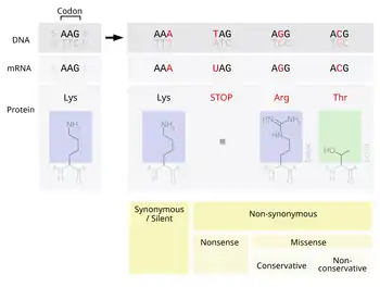 The sequence of a gene can be altered in a number of ways.[45] Gene mutations have varying effects on health depending on where they occur and whether they alter the function of essential proteins. Mutations in the structure of genes can be classified into several types.