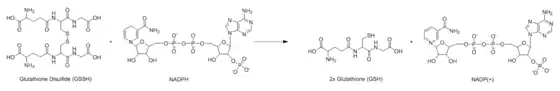 Glutathione reductase (GR) also known as glutathione-disulfide reductase (GSR) is an enzyme that in humans is encoded by the GSR gene. Glutathione reductase (EC 1.8.1.7) catalyzes the reduction of glutathione disulfide (GSSG) to the sulfhydryl form glutathione (GSH), which is a critical molecule in resisting oxidative stress and maintaining the reducing environment of the cell.[5][6][7] Glutathione reductase functions as dimeric disulfide oxidoreductase and utilizes an FAD prosthetic group and NADPH to reduce one molar equivalent of GSSG to two molar equivalents of GSH: