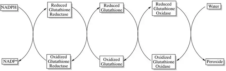 Glutathione plays a key role in maintaining proper function and preventing oxidative stress in human cells. It can act as a scavenger for hydroxyl radicals, singlet oxygen, and various electrophiles. Reduced glutathione reduces the oxidized form of the enzyme glutathione peroxidase, which in turn reduces hydrogen peroxide (H2O2), a dangerously reactive species within the cell. [In the following illustration of redox reeactions, the rightmost arrow is reversed; it should be pointing up not down.] In addition, it plays a key role in the metabolism and clearance of xenobiotics, acts as a cofactor in certain detoxifying enzymes, participates in transport, and regenerates antioxidants such and Vitamins E and C to their reactive forms. The ratio of GSSG/GSH present in the cell is a key factor in properly maintaining the oxidative balance of the cell, that is, it is critical that the cell maintains high levels of the reduced glutathione and a low level of the oxidized glutathione disulfide. This narrow balance is maintained by glutathione reductase, which catalyzes the reduction of GSSG to GSH.[5]