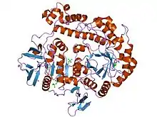 Glycoside hydrolases EC 3.2.1. are a widespread group of enzymes that hydrolyse the glycosidic bond between two or more carbohydrates, or between a carbohydrate and a non-carbohydrate moiety. A classification system for glycoside hydrolases, based on sequence similarity, has led to the definition of >100 different families.[1][2][3] This classification is available on the CAZy web site,[4][5] and also discussed at CAZypedia, an online encyclopedia of carbohydrate active enzymes.[6][7]