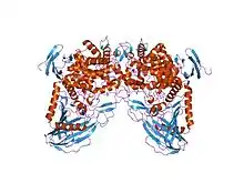 It consists of three structural domains. The C-terminal domain forms a two layered jelly roll motif. This domain is situated at the base of the catalytic domain, however its function remains unknown.[8] The central domain is the catalytic domain, which binds a phosphate ion that is proximal the highly conserved Glu. The arrangement of the phosphate and the glutamate is thought to cause nucleophilic attack on the anomeric carbon atom.[8] The catalytic domain also forms the majority of the dimerisation interface. The N-terminal domain is believed to be essential for catalytic activity[8] although its precise function remains unknown.
