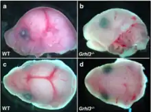 Grhl2 is involved in lower jaw formation of mammals, among other craniofacial developmental processes.[17][18] It is also evolutionarily closest to Grhl1, compared to Grhl3, while still exhibiting the highly conserved functions that all Grhl genes share.[14] It also appears that Grhl2 is involved in the fusion of the facial bones and that disruption to the regulation of Grhl2 can lead to cranioschisis/split face during embryonic development, often causing death.[19][20][11] Continuing with the trend of incomplete fusion, the formation of the neural tube and abdominal wall is also regulated by Grhl2, evident by observation of incomplete closure of these structures, leading to spina bifida and thoracoabdominoschisis, following loss of Grhl2 function in mutant mice models for Grhl2.[20][11] Additionally, over-expression of Grhl2 can also lead to mice developing spina bifida, showing the delicate balance in regulation required for Grhl2.[19] Grhl2 is also related to breast cancer progression due to its ability to regulate epithelial cells and other processes such as epithelial-mesenchymal transition (EMT), although it is not known if EMT is promoted or inhibited by Grhl2.[21] However, tumour progression is more associated with the epithelial tissue phenotype.[21] Interestingly, within zebrafish there are two separate orthologues, grhl2a and grhl2b.[16] Comparing the homology of these two orthologues to the human and mice equivalent, Grhl2, showed that grhl2b had 36 out of 47 amino acids identical (77% identical), meaning it was slightly more conserved than grhl2a, which had 34 out of 47 (72% identical).[2] grhl2b loss causes apoptosis throughout the brain and the nervous system of zebrafish.[2] A similar result came from a mouse study and led to the belief that grhl2b is a key survival factor for neural cells.[22]