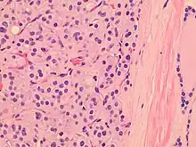 This mass can be detected and removed before transformation and metastasis. The tumor is often detected by imaging such as ultrasound. The location and size of the tumor may cause pressure and pain to the patient. But often the tumor goes undetected. After detection, the mass is tested using an invasive fine-needle aspiration biopsy.[5] Hürthle cell adenoma is the benign analogue of Hürthle cell carcinoma. This adenoma is extremely rare; when it occurs, it usually occurs in women. Often the adenoma is harmless but is removed after detection because its future course cannot be trusted.[2][3]