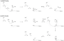 Studies of yeast Esa1 from the MYST family of HATs have revealed a ping-pong mechanism involving conserved glutamate and cysteine residues.[18] The first part of the reaction involves the formation of a covalent intermediate in which a cysteine residue becomes acetylated following nucleophilic attack of this residue on the carbonyl carbon of acetyl-CoA. Then, a glutamate residue acts as a general base to facilitate transfer of the acetyl group from the cysteine to the histone substrate in a manner analogous to the mechanism used by GNATs. When Esa1 is assembled in the piccolo NuA4 complex, it loses its dependence on the cysteine residue for catalysis, which suggests that the reaction may proceed via a ternary bi-bi mechanism when the enzyme is part of a physiologically relevant multiprotein complex.