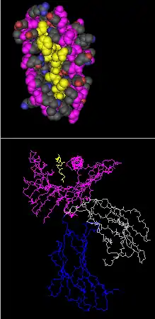 | Crystal Structure Of HlA-A2402 Complexed with a telomerase peptide PDB: 2BCK rendered with Cn3D!,space filling. Top panel - top down view of peptide (yellow) and HLA-A24 residues within 7 Angstroms of peptide. Bottom panel- side view peptide backbone with no side chains, peptide yellow, HLA-A magenta-blue, B2-microglobulin grey | ||