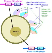 ![]() Illustration of HLA-DQ2.5 with deamidated gliadin peptide in the binding pocket.1s9v | |||||||||||||||||||||
