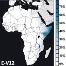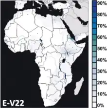 Outside of this core area of distribution (North Africa and the Horn of Africa), E-V68 is also observed in other parts of the continent at lower frequencies due to more recent dispersals. It is thus found today in pockets of the African Great Lakes and Southern Africa owing to early Afro-Asiatic-speaking settlers from the Horn region,[12] and as far west as Guinea-Bissau, where its presence has been tentatively attributed to trans-Saharan movements of people from North Africa.[14]