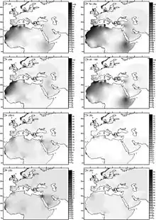 Haplogroup U has various subclades numbered U1 to U9. Haplogroup K is a subclade of U8.[15] The old age has led to a wide distribution of the descendant subgroups across Western Eurasia, North Africa, and South Asia. Some subclades of haplogroup U have a more specific geographic range.