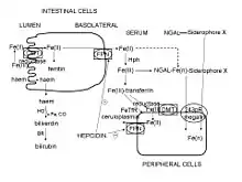Hepcidin is a regulator of iron metabolism. It inhibits iron transport by binding to the iron export channel ferroportin which is located in the basolateral plasma membrane of gut enterocytes and the plasma membrane of reticuloendothelial cells (macrophages), ultimately resulting in ferroportin breakdown in lysosomes.[10][11] It has been shown that hepcidin is able to bind to the central cavity of ferroportin, thus occluding iron export from the cell. This suggests that hepcidin is able to regulate iron export independently of ferroportin endocytosis and ubiquitination, and is thus quickly inducible and reversible.[12][13] In enterocytes, this prevents iron transmission into the hepatic portal system, thereby reducing dietary iron absorption. In macrophages, ferroportin inhibition causes iron sequestration within the cell. Increased hepcidin activity is partially responsible for reduced iron availability seen in anemia of chronic inflammation, such as kidney failure and that may explain why patient with end stage renal failure may not respond to oral iron replacement.[14]
