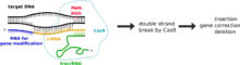 A duplex of crRNA and tracrRNA acts as guide RNA to introduce a specifically located gene modification based on the RNA 5' upstream of the crRNA. Cas9 binds the tracrRNA and needs a DNA binding sequence (5'NGG3'), which is called protospacer adjacent motif (PAM). After binding, Cas9 introduces a DNA double strand break, which is then followed by gene modification via homologous recombination (HDR) or non-homologous end joining (NHEJ).