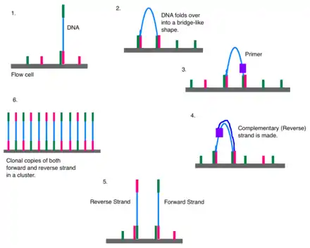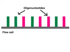 Adapters contain three different segments: the sequence complementary to solid support (oligonucleotides on flow cell), the barcode sequence (indices), and the binding site for the sequencing primer.[6] Indices are usually six base pairs long and are used during DNA sequence analysis to identify samples. Indices allow for up to 96 different samples to be run together, this is also known as multiplexing. During analysis, the computer will group all reads with the same index together.[8][9] Illumina uses a "sequence by synthesis" approach.[9] This process takes place inside of an acrylamide-coated glass flow cell.[10] The flow cell has oligonucleotides (short nucleotide sequences) coating the bottom of the cell, and they serve as the solid support to hold the DNA strands in place during sequencing. As the fragmented DNA is washed over the flow cell, the appropriate adapter attaches to the complementary solid support.