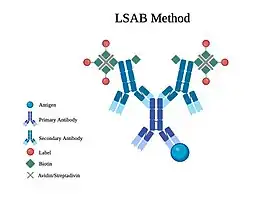 This technique is considered to be more sensitive than primary immunofluorescence, because multiple secondary antibodies can bind to the same primary antibody. The increased number of fluorophore molecules per antigen increases the amount of emitted light, and thus amplifies the signal.[1] There are different methods for attaining a higher fluorophore-antigen ratio such as the Avidin-Biotin Complex (ABC method) and Labeled Streptavidin-Biotin (LSAB method).[15][16]