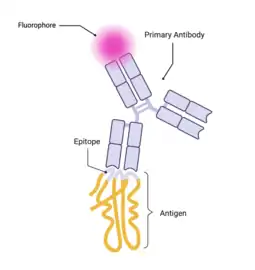Primary (direct) immunofluorescence (DIF) uses a single antibody, conjugated to a fluorophore. The antibody recognizes the target molecule (antigen) and binds to a specific region, called the epitope. The attached fluorophore can be detected via fluorescent microscopy, which, depending on the type of fluorophore, will emit a specific wavelength of light once excited.[1][14]
