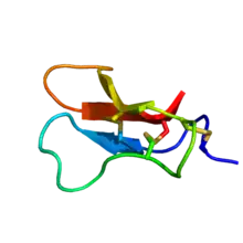 An inhibitor cystine knot (also known as ICK or Knottin) is a protein structural motif containing three disulfide bridges. Knottins are one of three folds in the cystine knot motif; the other closely related knots are the growth factor cystine knot (GFCK) and the cyclic cystine knot (CCK; cyclotide).[2] Types include a) cyclic mobius, b) cyclic bracelet, c) acyclic inhibitor knottins.[3] Cystine knot motifs are found frequently in nature in a plethora of plants, animals, and fungi and serve diverse functions from appetite suppression to anti-fungal activity.[4]
