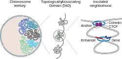 Topologically associating domains (TADs) are megabase-size regions of relatively high DNA interaction frequencies.[20][21] Mechanistic studies indicate TADs are single insulated neighborhoods or collections of insulated neighborhoods.[22]