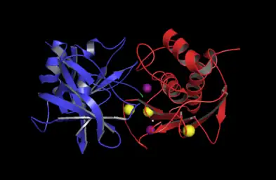 Stromelysin-1 also known as matrix metalloproteinase-3 (MMP-3) is an enzyme that in humans is encoded by the MMP3 gene. The MMP3 gene is part of a cluster of MMP genes which localize to chromosome 11q22.3.[5] MMP-3 has an estimated molecular weight of 54 kDa.[6]