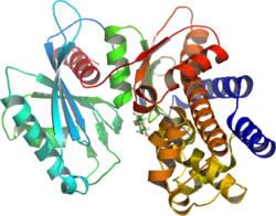 This is about half the size of the other mammalian hexokinases, which retain a degree of dimeric structure. Several sequences and the three-dimensional structure of the key active sites are highly conserved both in intra-species homologs and across species from mammals to yeast.[17] The ATP binding domain, for example, are shared with hexokinases, bacterial glucokinases, and other proteins, and the common structure is termed an actin fold.[18]
