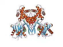 A distinctive feature of the gene is that it begins with two promoter regions.[22] The first exon from the 5' end contains two tissue-specific promoter regions. Transcription can begin at either promoter (depending on the tissue) so that the same gene can produce a slightly different molecule in liver and in other tissues. The two isoforms of glucokinase differ only by 13–15 amino acids at the N-terminal end of the molecule, which produces only a minimal difference in structure. The two isoforms have the same kinetic and functional characteristics.[5]