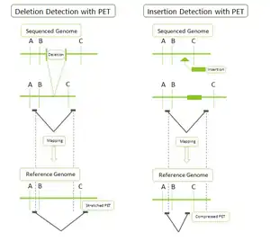 - DNA-PET: Because PET represent connectivity between the tags, the use of PET in genome re-sequencing has advantages over the use of single reads. This application is called pairwise end sequencing, known colloquially as double-barrel shotgun sequencing. Anchoring one half of the pair uniquely to a single location in the genome allows mapping of the other half that is ambiguous. Ambiguous reads are those that map to more than a single location. This increased efficiency reduces the cost of sequencing as these ambiguous sequences, or reads, would normally be discarded. The connectivity of PET sequences also allows detection of structural variations: insertions, deletions, duplications, inversions, translocations.[1][4] During the construction of the PET library, the fragments can be selected to all be of a certain size. After mapping, the PET sequences are thus expected to be consistently a particular distance away from each other. A discrepancy from this distance indicates a structural variation between the PET sequences. For example (Figure on the right): a deletion in the sequenced genome will have reads that map further away than expected in the reference genome as the reference genome will have a segment of DNA that is not present in the sequenced genome.