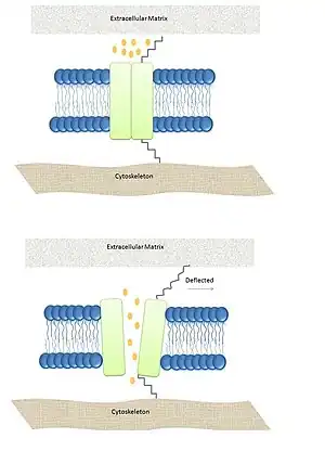 Mechanical deformations in the cell membrane can increase the probability of the channels opening. Proteins of the extracellular matrix and cytoskeleton are tethered to extra - and intra-cytoplasmic domains, respectively, of the stretch-activated ion channels. Tension on these mechanosensory proteins causes these proteins to act as a signaling intermediate, resulting in the opening of the ion channel.[53] All known stretch-activated ion channels in prokaryotic cells have been found to be opened by direct deformation of the lipid bilayer membrane.[55] Channels that have been shown to exclusively use this mechanism of gating are the TREK-1 and TRAAK channels. In studies using mammalian hair cells, the mechanism that pulls on proteins tethered from the intra- and extra-cytoplasmic domain of the channel to the cytoskeleton and extracellular matrix, respectively, is the most likely model for ion channel opening.[55]
