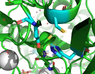 The two NAT enzymes in humans are NAT1 and NAT2.[4] Mice and rats express three enzymes, NAT1, NAT2, and NAT3.[4] NAT1 and NAT2 have been found to be closely related in species examined thus far, since the two enzymes share 75-95% of their amino acid sequence.[9][10] Both also have an active site cysteine residue (Cys68) in the N-terminal region.[9][10] Further, all functional NAT enzymes contain a triad of catalytically essential residues made up of this cysteine, histidine, and asparagine.[7] It has been hypothesized that the catalytic effects of the breast cancer drug Cisplatin are related to Cys68.[11] The inactivation of NAT1 by Cisplatin is caused by an irreversible formation of a Cisplatin adduct with the active-site cysteine residue.[11] The C-terminus helps bind acetyl CoA and differs among NATs including prokaryotic homologues.[12]