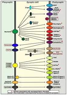 - Dean C, Dresbach T (January 2006). "Neuroligins and neurexins: linking cell adhesion, synapse formation and cognitive function". Trends in Neurosciences. 29 (1): 21–29. doi:10.1016/j.tins.2005.11.003. PMID 16337696. S2CID 11664697.