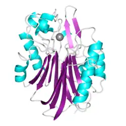 Nocturnin contains a c-terminal structural domain of the Endonuclease/Exonuclease/phosphatase family (EEP). Its protein fold is similar to that of DNase I, AP endonuclease, INPP5B, Sphingomyelin phosphodiesterase, TDP2, PDE12, and CNOT6L. As in the other EEP members, five conserved catalytic residues help coordinate a Magnesium atom, for Nocturnin the divalent metal participates in the NADP(H) phosphatase activity. The first structures of human Nocturnin were solved in 2017-2018 (6BT1,[12] 6BT2,[12] and 6MAL[11]). All three were of the c-terminal EEP-like domain of Nocturnin bound to its cofactor magnesium. In December 2018, the first structure of Nocturnin bound to its natural substrate, NADPH, was determined, 6NF0.[5][6]