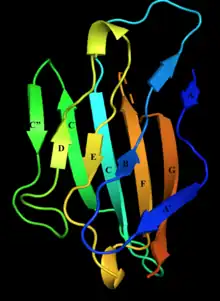 ![]() Structure of myelin protein zero's extracellular domain with labelled beta strands. Strands D, E, B, and A make up one beta sheet, Strands A', G, F, C, C', C'' make up the other beta sheet. | |||||||||