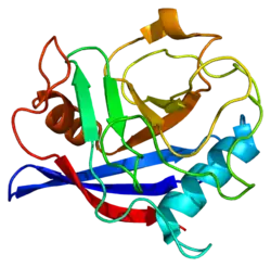 The protein encoded by this gene is a member of the peptidyl-prolyl cis-trans isomerase (PPIase) family. PPIases catalyze the cis-trans isomerization of proline imidic peptide bonds in oligopeptides and accelerate the folding of proteins.[5] Generally, PPIases are found in all eubacteria and eukaryotes, as well as in a few archaebacteria, and thus are highly conserved.[6][9] The PPIase family is further divided into three structurally distinct subfamilies: cyclophilin (CyP), FK506-binding protein (FKBP), and parvulin (Pvn).[6][8] As a cyclophilin, PPI binds cyclosporin A (CsA) and can be found within in the cell or secreted by the cell.[7] In eukaryotes, cyclophilins localize ubiquitously to many cell and tissue types.[7][8] In addition to PPIase and protein chaperone activities, cyclophilins function in mitochondrial metabolism, apoptosis, immunological response, inflammation, and cell growth and proliferation.[6][7][8] PPIE in particular also exhibits RNA-binding activity.[5]