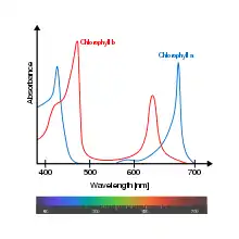 Plants usually convert light into chemical energy with a photosynthetic efficiency of 3–6%.[40][41] Absorbed light that is unconverted is dissipated primarily as heat, with a small fraction (1–2%)[42] reemitted as chlorophyll fluorescence at longer (redder) wavelengths. This fact allows measurement of the light reaction of photosynthesis by using chlorophyll fluorometers.[42]