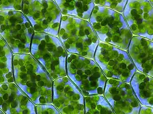 Although all cells in the green parts of a plant have chloroplasts, the majority of those are found in specially adapted structures called leaves. Certain species adapted to conditions of strong sunlight and aridity, such as many Euphorbia and cactus species, have their main photosynthetic organs in their stems. The cells in the interior tissues of a leaf, called the mesophyll, can contain between 450,000 and 800,000 chloroplasts for every square millimeter of leaf. The surface of the leaf is coated with a water-resistant waxy cuticle that protects the leaf from excessive evaporation of water and decreases the absorption of ultraviolet or blue light to minimize heating. The transparent epidermis layer allows light to pass through to the palisade mesophyll cells where most of the photosynthesis takes place.
