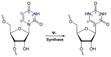 RNA is transcribed with only four bases (adenine, cytosine, guanine and uracil),[15] but these bases and attached sugars can be modified in numerous ways as the RNAs mature. Pseudouridine (Ψ), in which the linkage between uracil and ribose is changed from a C–N bond to a C–C bond, and ribothymidine (T) are found in various places (the most notable ones being in the TΨC loop of tRNA).[16] Another notable modified base is hypoxanthine, a deaminated adenine base whose nucleoside is called inosine (I). Inosine plays a key role in the wobble hypothesis of the genetic code.[17]
