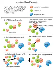 - Baldwin D, Rudge S (1993). "Moclobemide: a reversible inhibitor of monoamine oxidase type A". British Journal of Hospital Medicine. 49 (7): 497–9. PMID 8490690.