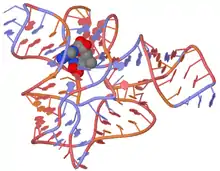 The structure of the SAM riboswitch has been determined with X-ray crystallography.[6] The SAM riboswitch is organized about a four way junction, with two sets of coaxially stacked helices arranged side-by-side. These stacks are held together by a pseudoknot formed between the loop on the end of stem P2 and the J3/4 joining region. The formation of the pseudoknot is facilitated by a protein-independent kink turn that induces a 100° bend into P2. Ribosomal proteins, known to bind kink-turns in the ribosome, favor SAM aptamer folding by interacting with P2 kink-turn motif.[7] Both the kink-turn and the pseudoknot are critical to the establishment of the global fold and productive binding. The binding pocket is split between conserved, tandem AU pairs in stem P1, the conserved G in the J1/2 joining region, and the conserved asymmetric bulge in stem P3. The adenosyl and methionine main-chain moieties of SAM are recognized through hydrogen-bonding into the bulge in P3 and the conserved G in J1/2. The methyl group is recognized indirectly through the charged sulfur, which forms an electrostatic interaction with the negative surface potential created by the tandem AU pairs in the minor groove of P1. These pairs are highly conserved and alterations to the orientation of these pairs, as well the identity of the bases in the pairs (i.e., GC pairs instead of AU pairs) result in reduced affinity for SAM. Affinity for SAH, however, is unaffected by changes to the P1 sequence, further supporting the idea that the interaction between SAM and the P1 helix is electrostatic in nature.