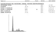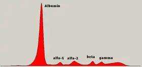![]() Normal serum protein electrophoresis diagram with legend of different zones. | |